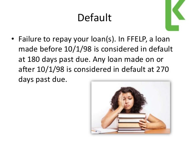 Payment, compliance with student loan regulations, and collection of defaulted loans. When a student fails to repay the loan and enters default (becomes 270 days past due), the holder of the loan(s) files a ... Access Doc